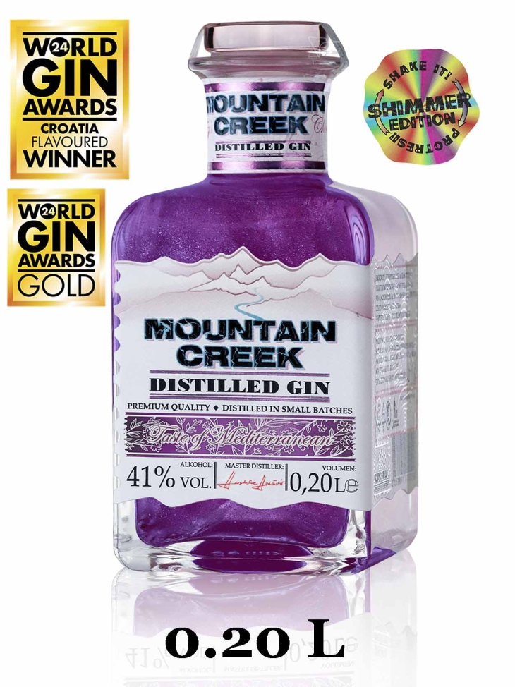 GIN Mountain Creek taste of mediterranean SHIMMER EDITION gin je premium craft gin proizveden od najboljih sastojaka, najkvalitetnijeg pšeničnog destilata, pažljivo biranog bilja, te meke planinske izvorske vode iz Unesco Geoparka i Parka prirode Papuk. Kreiran mješavinom pomno biranih biljnih sastojaka, nudi skladnu kombinaciju okusa koja vas nosi na suncem okupane obale Mediterana. Svakim gutljajem možete osjetiti esenciju jarkih agruma, te mirisnog i aromatičnog bilja, prvenstveno cvjetne lavande, te neodoljivog ružmarina. U kombinaciji sa izvorskom vodom i premium destilatom rezultira filigranskom glatkoćom i dubinom okusa. Aroma gina je istovremeno osnažujuća i umirujuća , stvarajući nezaboravno osjetilno iskustvo koje će vas rapsodijom svojeg okusa zasigurno odvesti u vrtove na osunčanim obalama Mediterana. Taste of Mediterranean je gin punog tijela i karaktera koji nudi uistinu očaravajući okus i miris bilo da se uživa samostalno ili u koktelu.