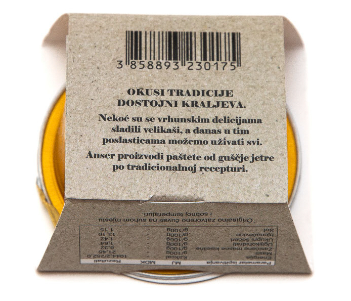 Fino usitnjeni pate s 25% guščje jetre i aromom tartufa, koji ovom delikatesnom proizvodu daju
