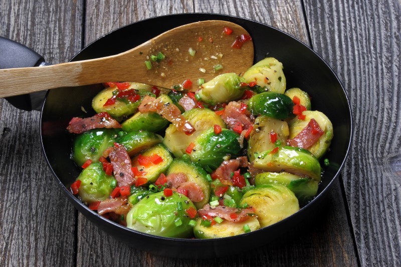 Na vreloj masnoći popržite sitno nasjeckani luk. Dodajte mrkvu narezanu na ploške, prokulice i rotkvice prerezane na pola i repu narezanu na kockice.